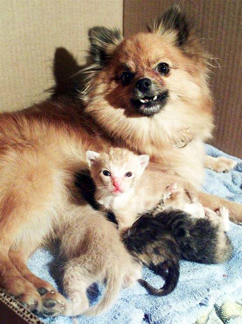 H Chia είναι ένα παιχνιδιάρικο Pomeranian που μόλις είχε γεννήσει τρία κουτάβια. Αν και δύο μηνών «λεχώνα» δεν δίστασε καθόλου να αναλάβει τα ορφανά γατάκια που έφερε στο σπίτι ένας φίλος της οικογένειας.