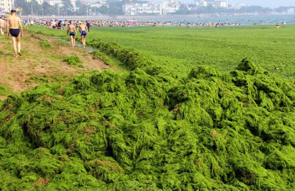 οι ακτές της Κίτρινης Θάλασσας στην Κίνα έγιναν πράσινες αλλά οι λουόμενοι συνεχίζουν να χαίρονται τα μπάνια τους