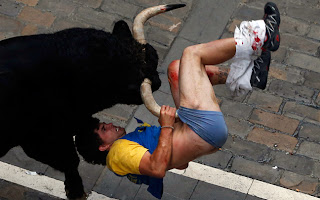πλαίσιο του φεστιβάλ Σαν Φερμίν στην Παμπλόνα της Ισπανίας. Ένας ταύρος χτύπησε τον νεαρό και το ένα κέρατό του τον διαπέρασε κοντά στα γεννητικά όργανα.