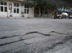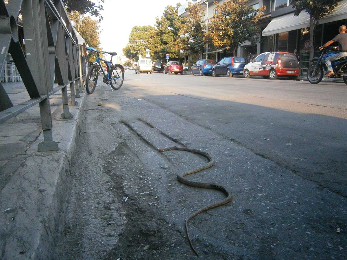 Ένα δίμετρο φίδι σουλατσάριζε στην Οδό Στρατηγού Σαράφη μόλις 30 μέτρα από την κεντρική πλατεία των Τρικάλων, 5 μέτρα από το ΑΤΜ του Ταχυδρομικού Ταμιευτηρίου και στην είσοδο καταστημάτων…